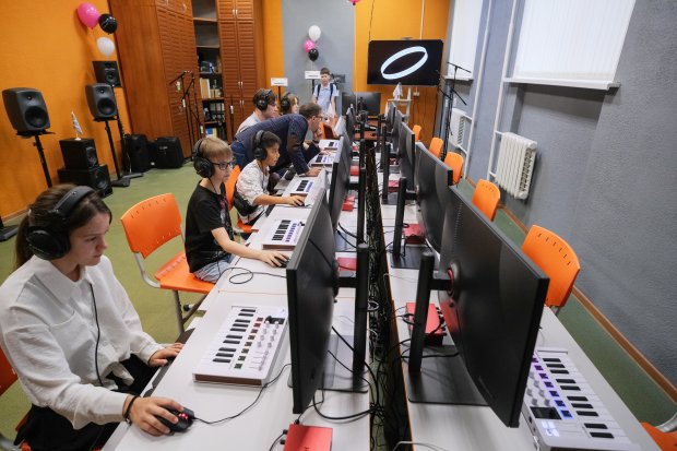 Студия электронной музыки на первый взгляд напоминает офис какой-нибудь IT-компании. У каждого ребенка тут есть индивидуальное рабочее место с персональным компьютером. Сенсорный мини-контроллер реагирует на прикосновения. Современный навороченный микрофон и звукоизоляционная акустическая кабина готовы для записи первых шедевров. За пультом ребята смогут попробовать себя в качестве диджея.